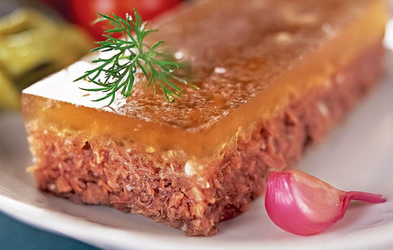 У спеціальну форму наливають трохи бульйону, викладають м’ясо і знову заливають бульйоном. Ставлять в холодильник на шість годин.