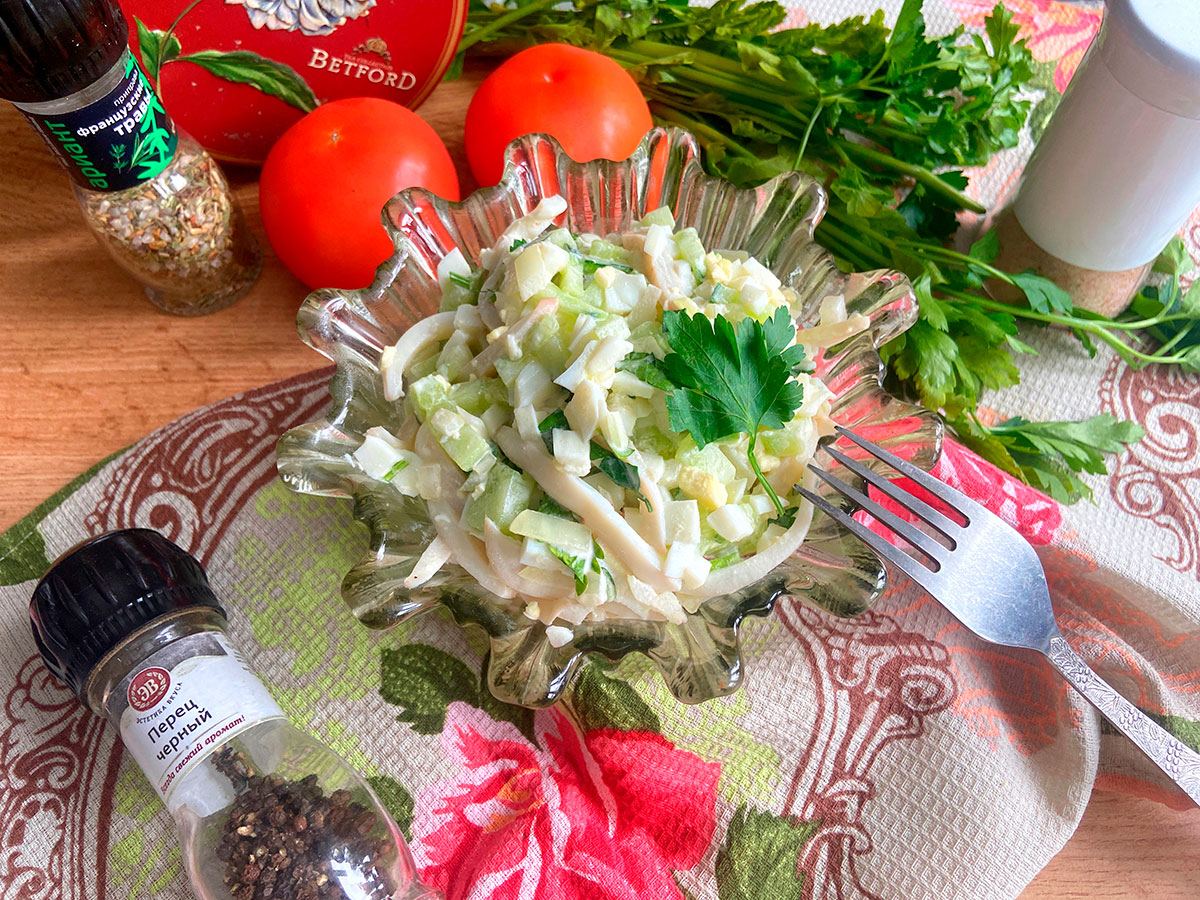 Любителі морепродуктів неодмінно оцінять салат із кальмарами. Свіжість і легкість цій страві надає огірок, саме він робить салат таким соковитим. Щодо майонезу, то намагайтеся використовувати домашній – так ви можете повністю контролювати склад соусу. Обов'язково додайте в салат цибулю, лише попередньо вимочіть її в гарячій воді, щоб уникнути неприємного гіркого присмаку.