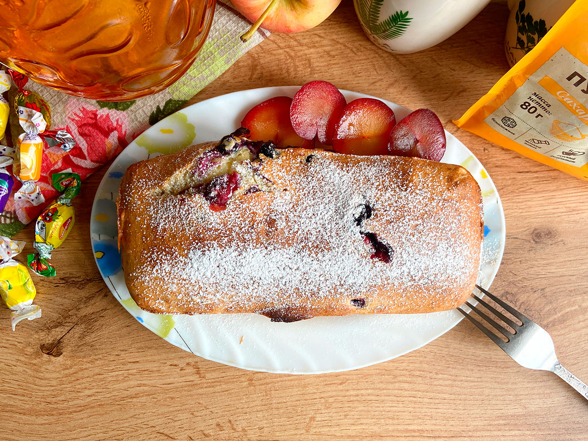 Готовий кекс потрібно прикрасити цукровою пудрою. Також можна використовувати як декор будь-які свіжі ягоди та фрукти.