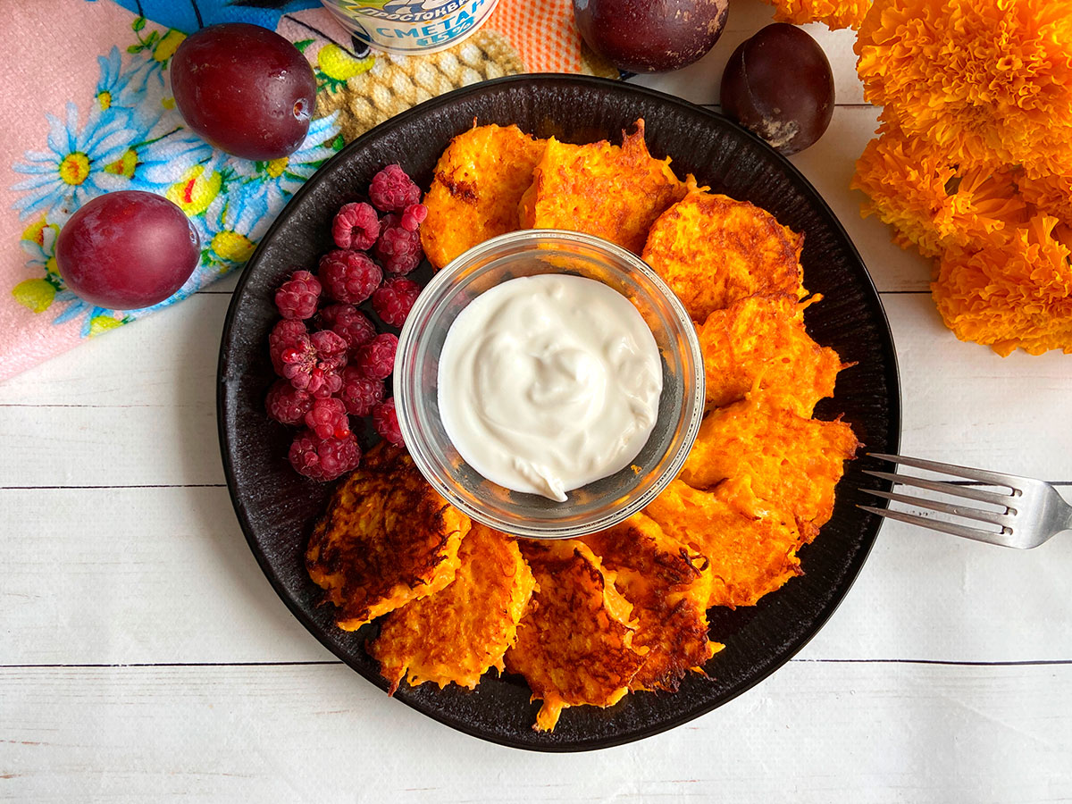 Оладки з морквою будуть доречними, якщо йдеться про сніданок або полуденок у тісному сімейному колі. Такі оладки готуються зовсім без цукру, проте виходять солодкуватими – і це за рахунок моркви. Незважаючи на несподіване для сніданку поєднання продуктів — пікантної цибулі та солодкої моркви, такі оладки виявляться цікавими навіть для дітей. Головне – обов'язково доповнити їх сметаною.