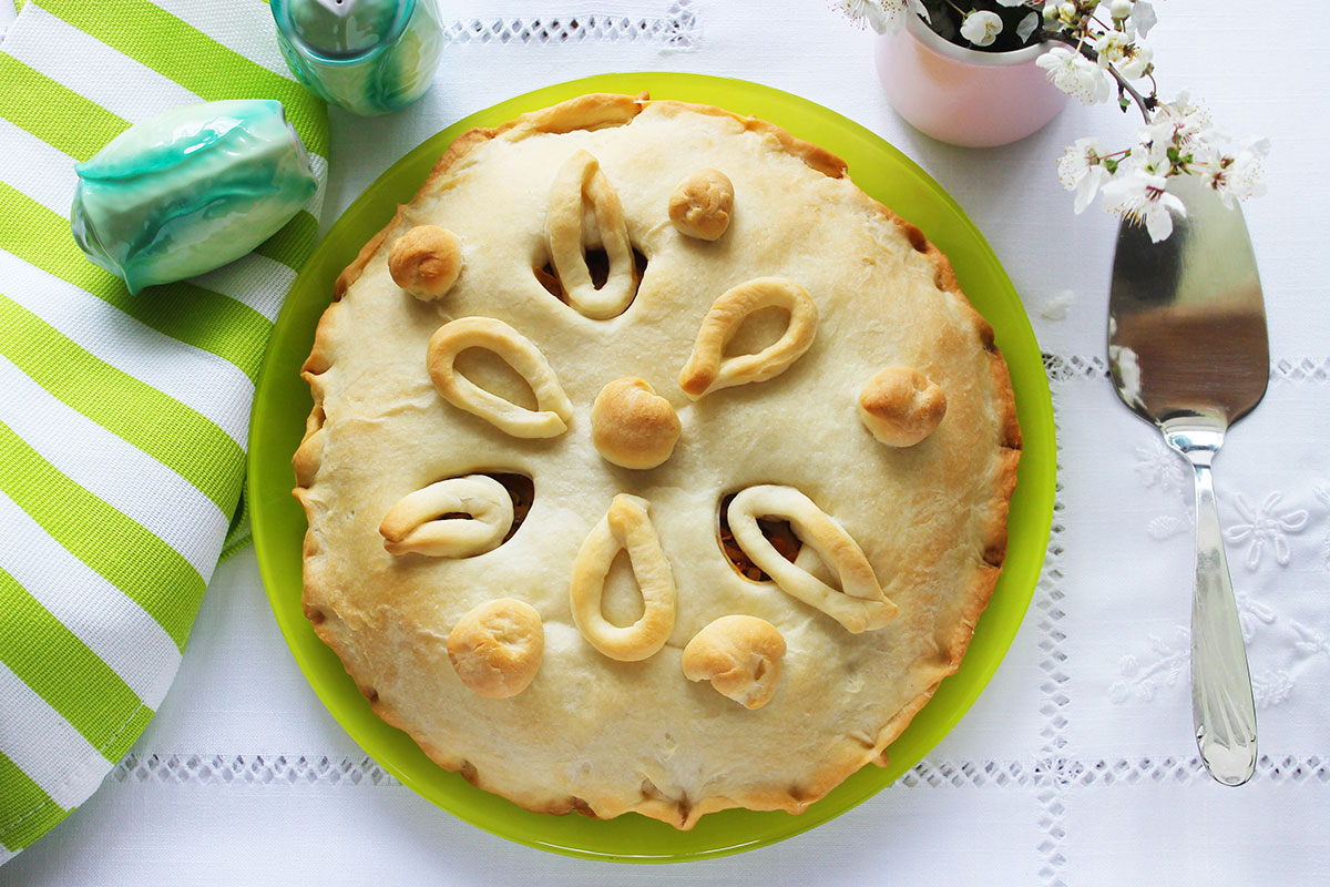 22. Розкотіть у пласт другий шар, який менше. Зробіть у ньому один або кілька отворів для виходу пари. Накрийте цим шаром начинку. Краї нижнього шару підніміть та з'єднайте з верхнім. Защипніть будь-яким способом.