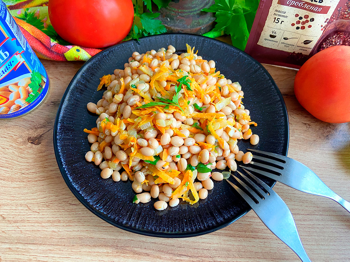 4. Продовжуйте обсмажувати овочі протягом трьох хвилин, а потім викладіть на сковороду квасолю, попередньо зливши з неї рідину.