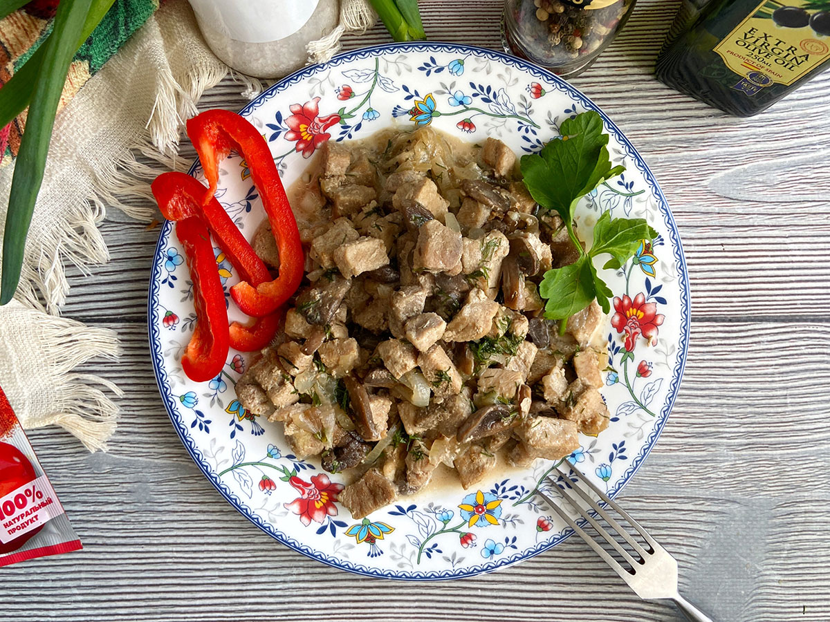 Перша асоціація при дегустації цієї страви – жульєн. Але тут звичні вершки замінюються плавленим сиром. Свинина чудово поєднується з печерицями, а цибуля та плавлений сир створюють досить густий та ароматний соус. Страва виходить надзвичайно ситна, про таке кажуть – багато не з'їси. І тому варто обов'язково доповнити його гарніром, наприклад, рисом чи гречкою, а також свіжими овочами.