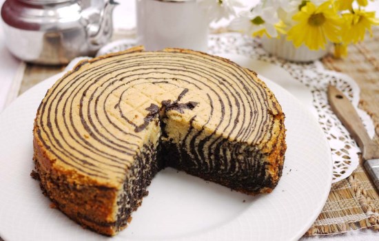 Оригінальний сирний торт «Зебра» в мультиварці (на бісквіті)